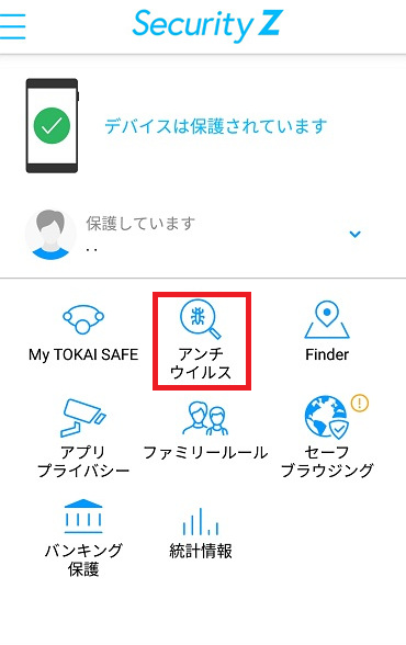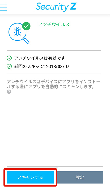 ①Security Z SAFE を起動し、「アンチウイルス」をタップしてください。