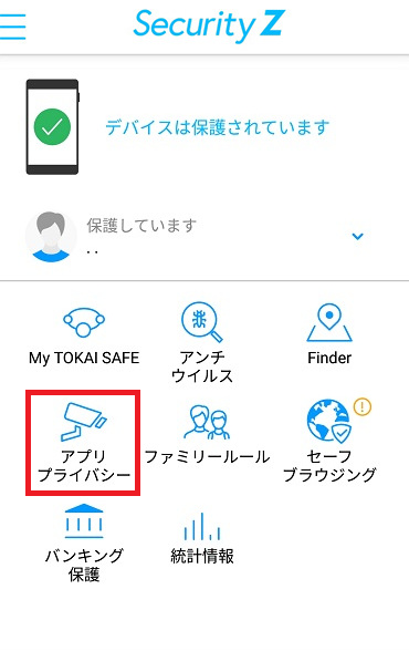 ①Security Z SAFE を起動し、「アプリプライバシー」をタップしてください。