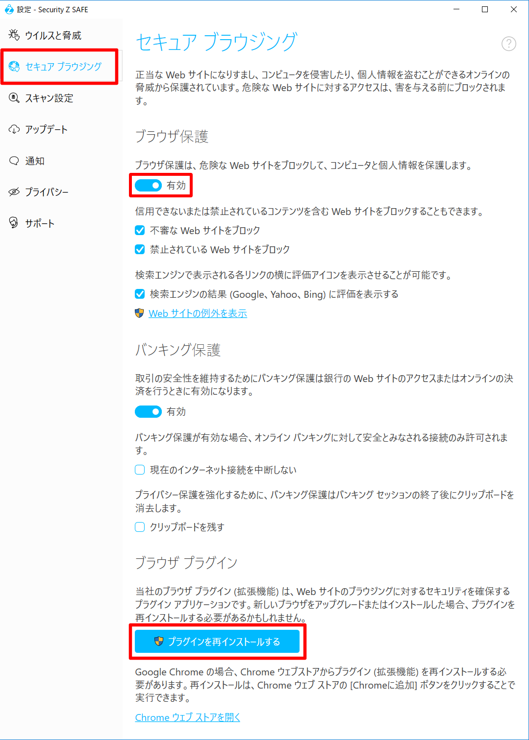 ②設定画面が開きますので、「セキュア ブラウジング」をクリックしてください。ブラウザプラグインの設定画面が開きますので、ブラウザ保護が有効になっているか確認し、「プラグインを再インストールする」をクリックします。