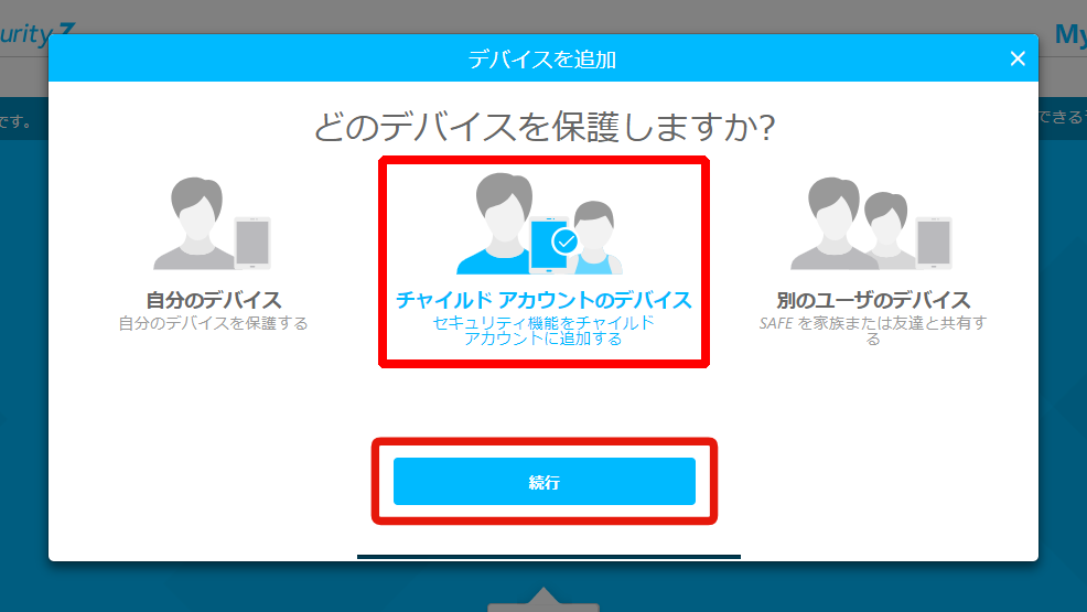 ③「チャイルド アカウントのデバイス」を選択して、「続行」をクリックします。