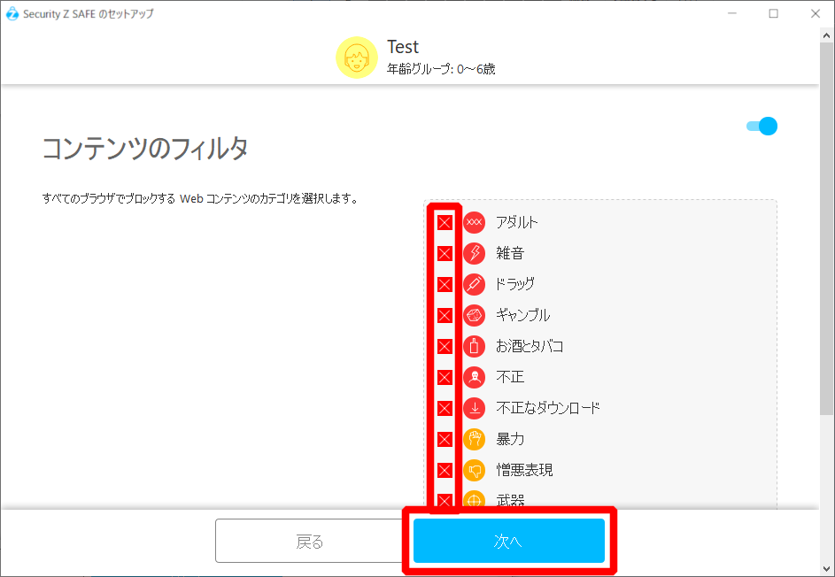 g. 子供に閲覧制限をかけたい場合には、Webコンテンツのタイプを選択して「次へ」をクリックします。