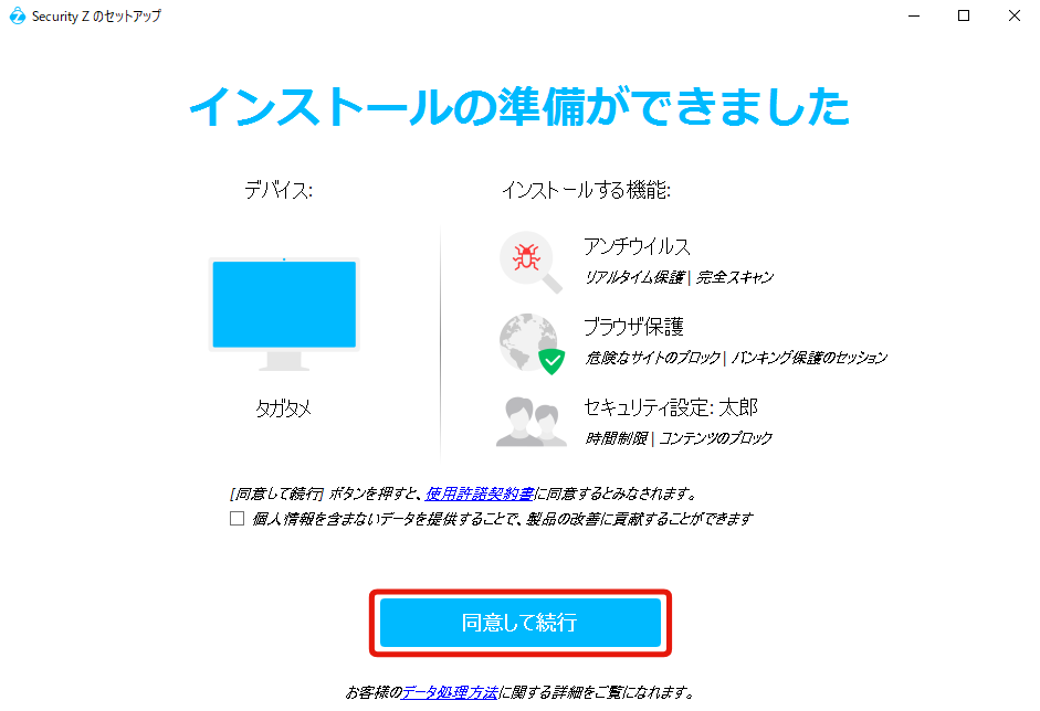 ⑥インストーラーファイルを実行します。Security Z SAFE のセットアップが開始します。