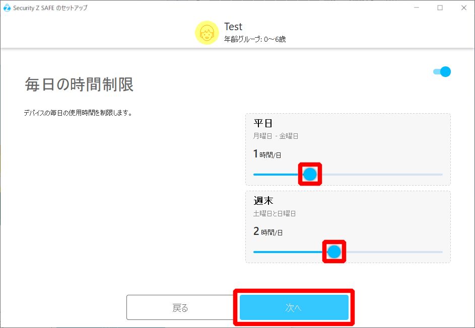 d. 子供に時間制限とコンテンツのフィルタを設定するには、「次へ」をクリックします。