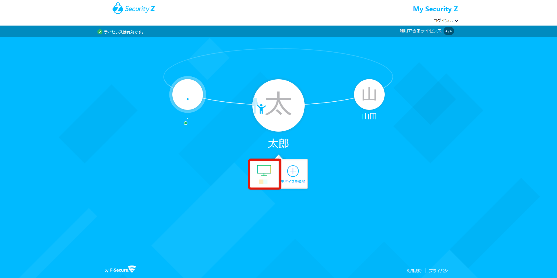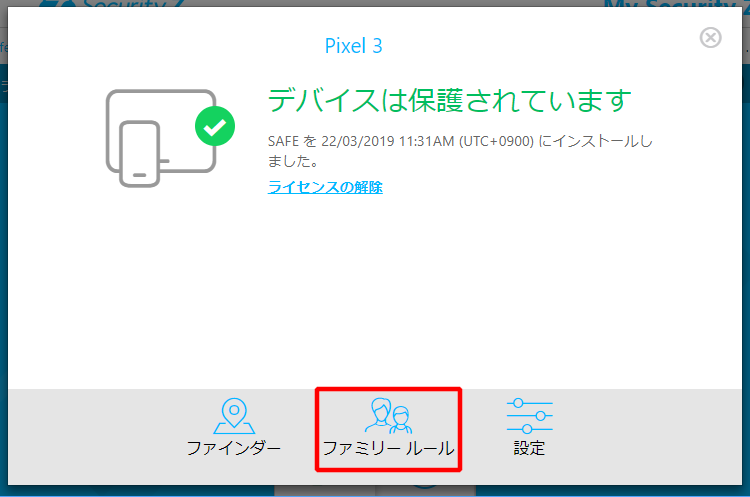 機能制限 ユーザアカウント 契約者マスターユーザアカウント 追加された家族・友人サブユーザアカウント 子供チャイルドアカウント プロフィール 大人 大人※1 子供 ユーザID(メールアドレス) メールアドレス マスターユーザアカウントと別ID(メールアドレス) マスターユーザアカウントと同じID(メールアドレス) ユーザアカウントの管理 サブユーザアカウントの追加・削除・確認 ○ × × チャイルドアカウントの管理 サブユーザアカウントの追加・削除・確認 ○ × × デバイスの管理※2 自分のユーザアカウント用のデバイスの追加・削除・確認 ○ ○※3 × 新規のサブユーザアカウント用のデバイスの追加※4 ○ × × 既存の他のサブユーザアカウント用のデバイス 追加 × × × 削除・確認 ○ × × チャイルドアカウント用のデバイスの追加・削除・確認 ○ × × ファミリールールの設定 チャイルドアカウントデバイスのリモートペアレンタルコントロール ○ × × ※1 新しいユーザは「サブユーザ」として大人のプロフィールが固定で割り当てられます。サブユーザではチャイルドアカウントの追加、ファミリールールは設定できません。※2 「My Security Z」ポータルにはユーザアカウントのデバイスが表示され、確認できます。※3 「My Security Z」ポータルには自分のユーザアカウント用のデバイスのみが表示され、確認できます。※4 サブユーザアカウントの追加となります。
