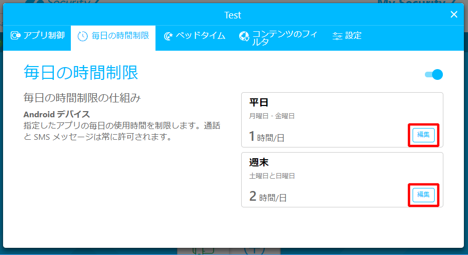⑤「時間制限」では、チャイルドアカウントで利用しているデバイス上の電話とSMS以外のアプリの使用時間の編集/設定が可能です。
