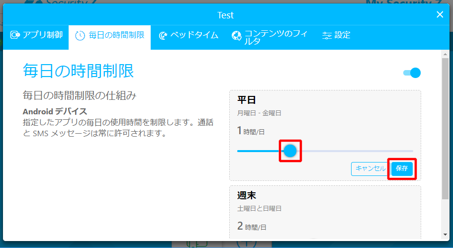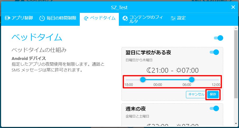 d. [翌日に学校がある夜]、[週末の夜]を設定したうえ、各項目の「保存」をクリックします。