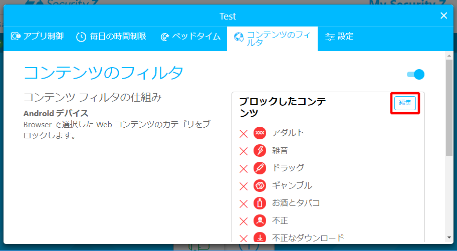 ※コンテンツフィルタはWindows,Macではブラウザプラグインのインストールが必要になります。Android,iOSではセーフブラウザ上でのみ有効となります。a. コンテンツのフィルタ機能の「編集」をクリックします。