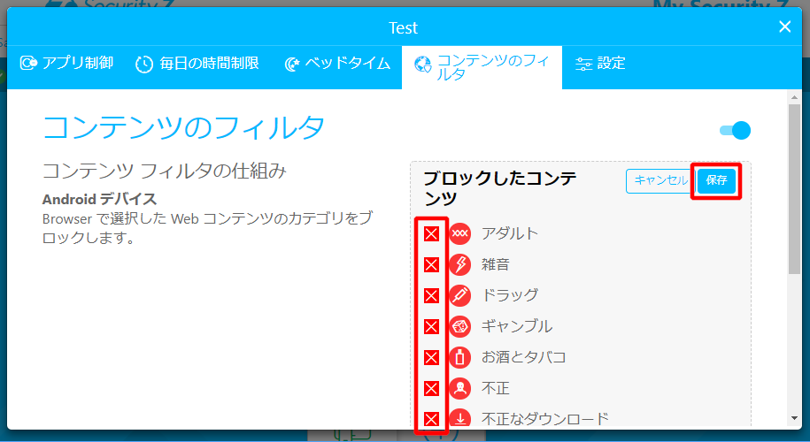 ⑥「コンテンツのフィルタ」では、チャイルドデバイス上でブロックしたいコンテンツの編集/設定が可能です。