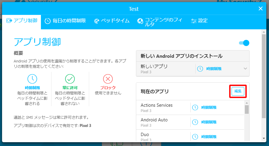 ※Androidでチャイルドアカウントを使用している場合のみ設定できます。 a. アプリ制御機能の「編集」をクリックします。