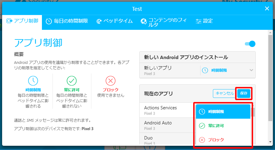 b. 制御したい既存アプリの右側の設定メニューから「時間制限」、「常に許可」、「ブロック」のいずれかを選択し、「保存」をクリックします。