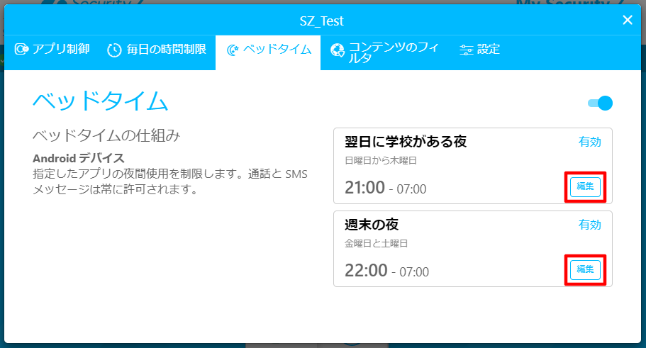 c. 「ベッドタイム」で各項目([翌日に学校がある夜]、[週末の夜])で設定したい項目の「編集」をクリックしてください。