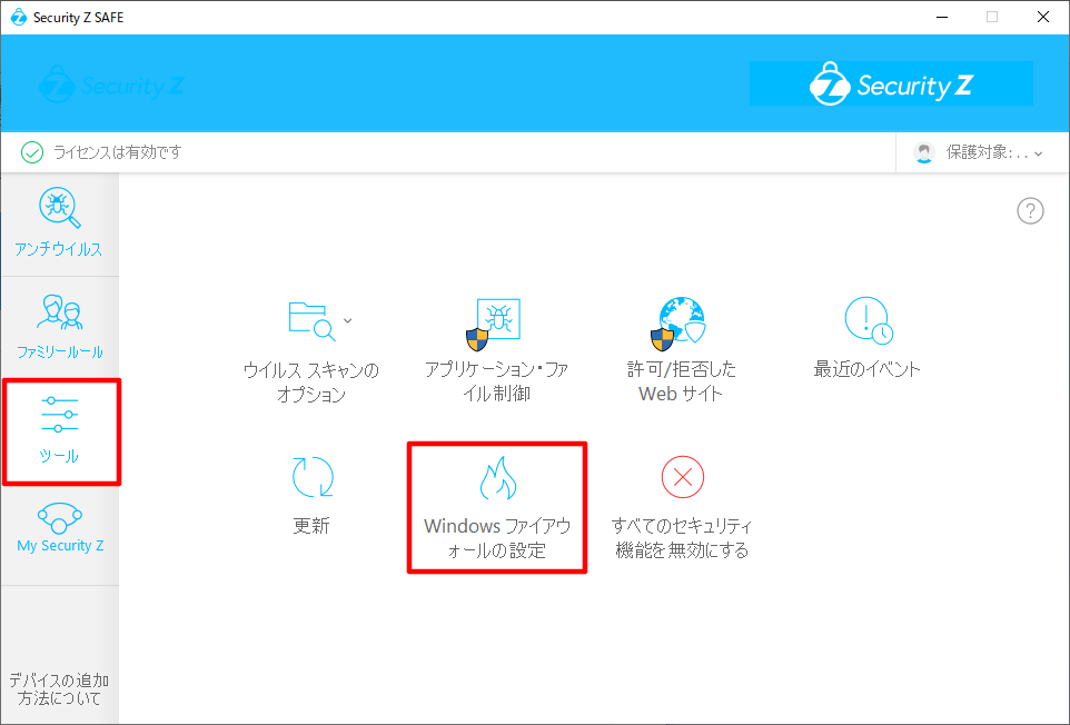 ①Security Z SAFE のツールをクリックし、「Windowsファイアウォールの設定」をクリックしてください。