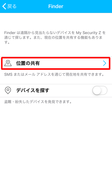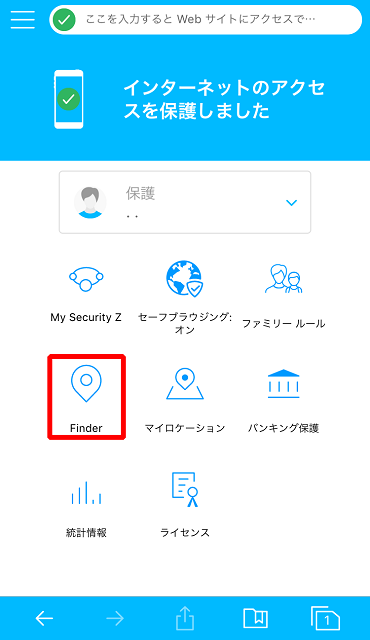 ①Security Z SAFE を起動し、「Finder」をタップしてください。