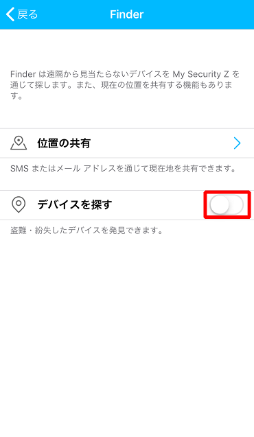 ②「デバイスを探す」の右にあるスイッチをタップすることで、My Security Zから紛失した際などにGPSで位置を特定することができます。