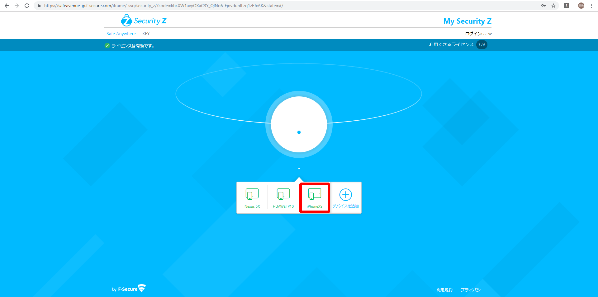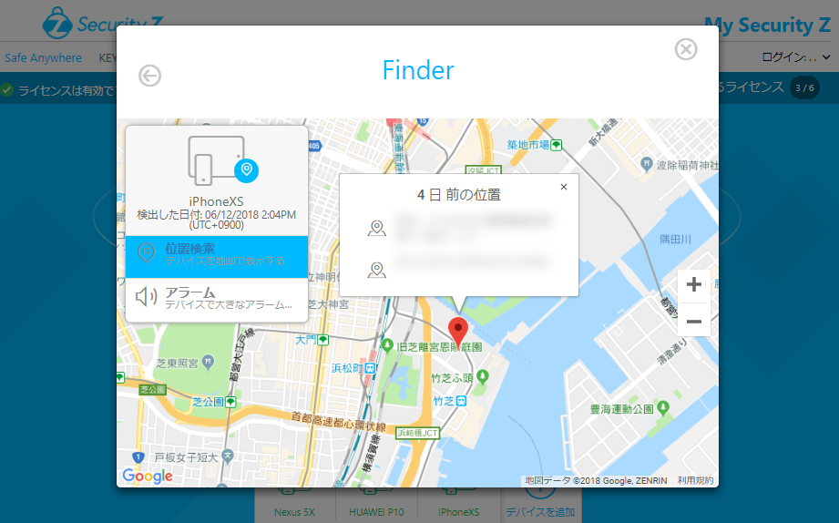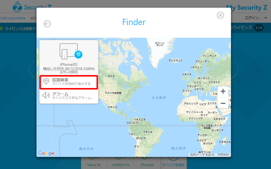 ③実際にデバイスが無くなってしまい探す必要がある場合は、お使いのコンピュータ等で「My Security Z」へログインいただき登録済みの該当の端末名をクリックしてください。