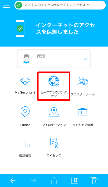 ①Security Z SAFE を起動し、「セーフブラウジング」をタップしてください。