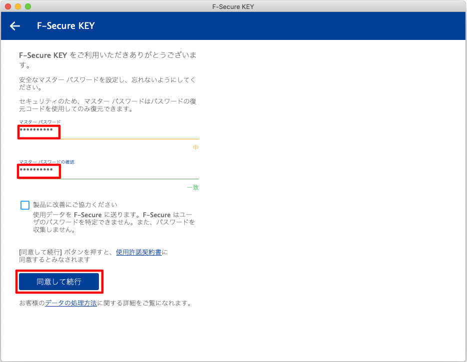 ⑪マスターパスワードを入力してください。マスターパスワードは、KEYのアプリを開くために必要なパスワードです。12文字以上で、アルファベット大文字・小文字・数字・記号のすべての種類の文字を使うことを推奨しています。使用許諾書の内容を確認した上で[同意して続行]をクリックしてください。