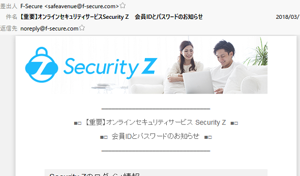 ①safeavenue@f-secure.com より「【重要】オンラインセキュリティサービス Security Z 会員IDとパスワードのお知らせ」というメールが届きます。