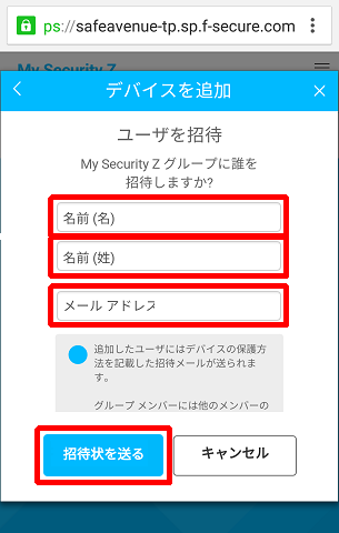 16.招待したいユーザの氏名・メールアドレスを入力し、「招待状を送る」をタップしてください。