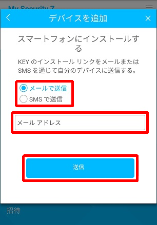 20.「このデバイス」以外のデバイスを選択した場合には、メールで送信 または SMSで送信 のいずれかを選択し、メールアドレス または 電話番号 を入力してください。入力後「送信」をタップしてください。