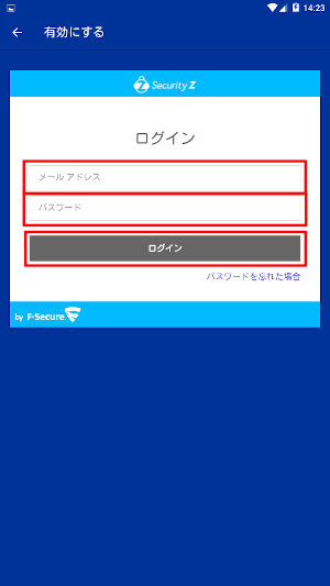 11.ログイン画面が表示された場合は、「【重要】オンラインセキュリティサービス Security Z 会員IDとパスワードのお知らせ」メールに記載されているSecurity Z 会員ID(メールアドレス)とパスワードを入力し、[ログイン]をタップしてください。