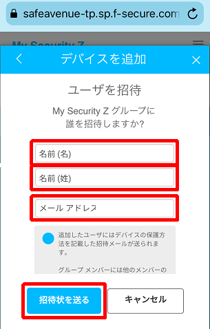 20.招待したいユーザの氏名・メールアドレスを入力し、「招待状を送る」をタップしてください。