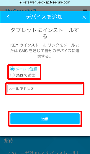 24.「このデバイス」以外のデバイスを選択した場合には、メールで送信 または SMSで送信 のいずれかを選択し、メールアドレス または 電話番号 を入力してください。入力後「送信」をタップしてください。