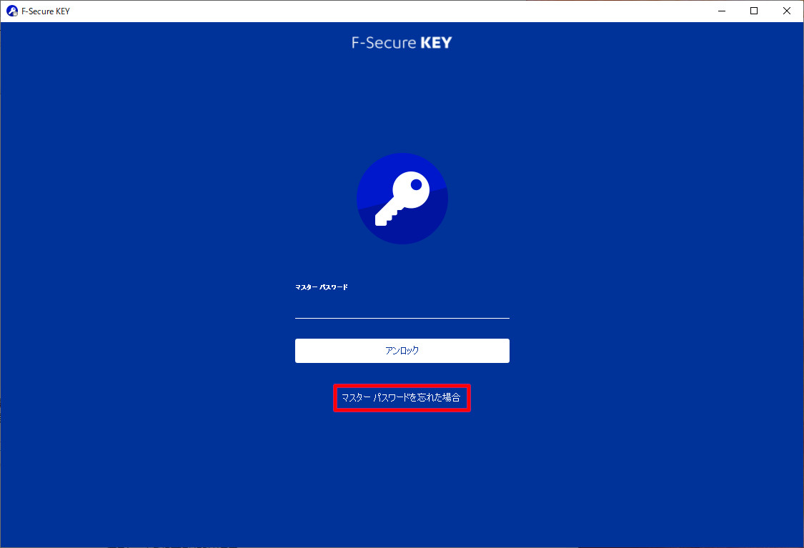 ①Keyのアプリを起動し、画面の下の「マスターパスワードを忘れた場合」をクリックしてください。