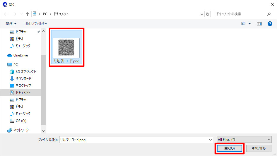 ③保存されているリカバリーコードの画像を選択し、インポートしてください。