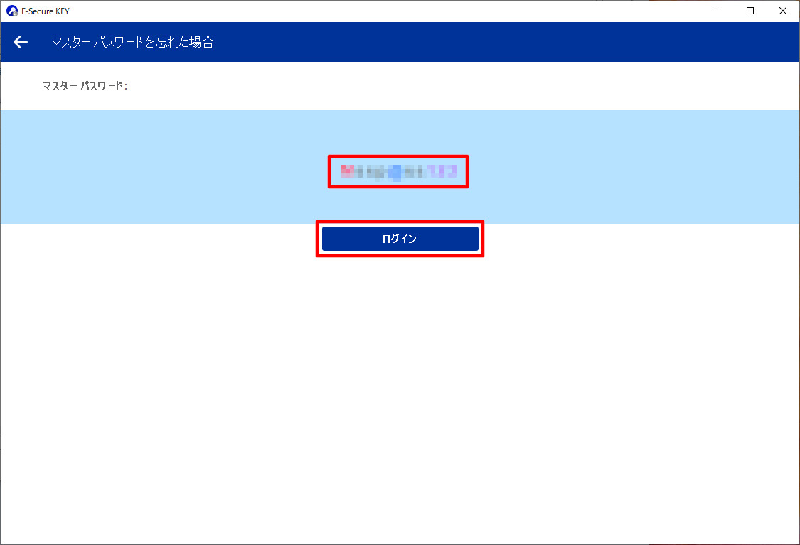 ④復旧されたマスターパスワードが表示されますので、ご確認の上必ず覚えておいてください。[ログイン]をクリックしてください。
