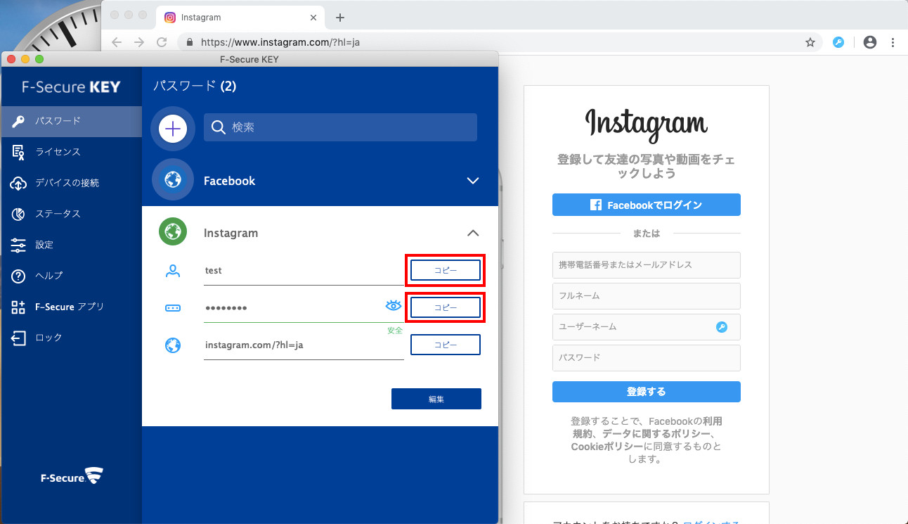 ⑮同様に別のサービスもご利用いただけますが、自動ログインできない場合もあります。その場合はKEYアプリケーションを立ち上げ「ユーザーネーム」と「パスワード」をコピーした上、対象サービスのログイン画面に貼り付けてログインを行ってください。