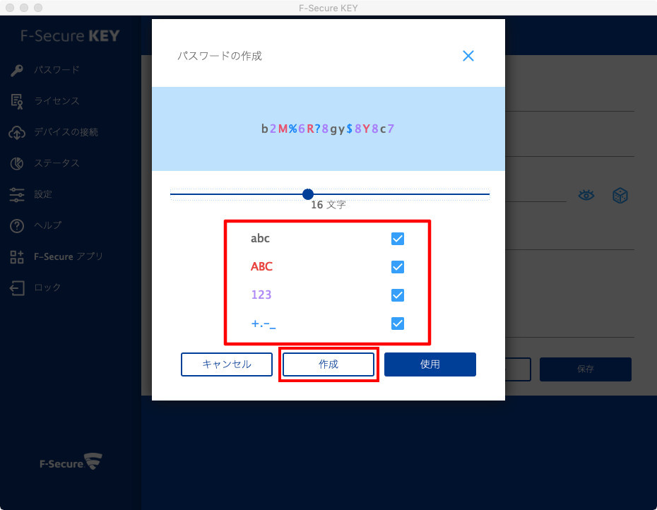 ⑤パスワードの作成画面が表示されますので、各サービスのパスワード作成ルールに従って、パスワードの文字数、およびアルファベット大文字・小文字・数字・記号の組み合わせを選択し、「作成」ボタンをクリックします。