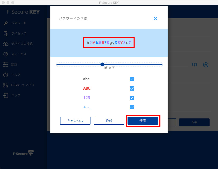 ⑥作成されたパスワードを確認の上、よろしければ「使用」ボタンをクリックしてください。