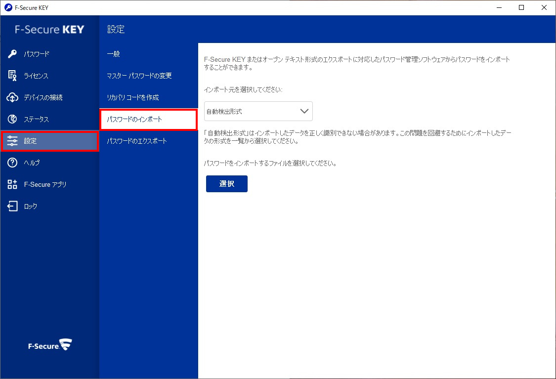 ⑥メニュー画面で設定を開き、パスワードのインポートを選択します。