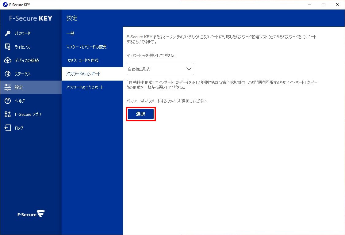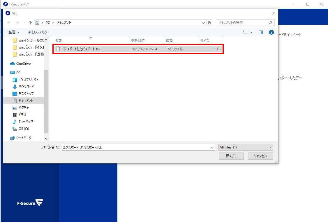 ⑧ファイルの選択画面が開きますので、エクスポートしておいたパスワードファイルを選択します。
