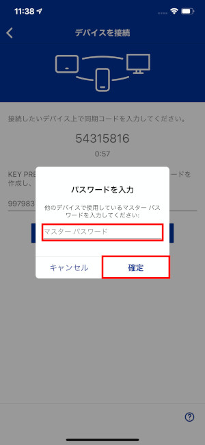 ⑦同期コードを発行したデバイスのマスターパスワードを入力後、「確定」をクリックしてください。