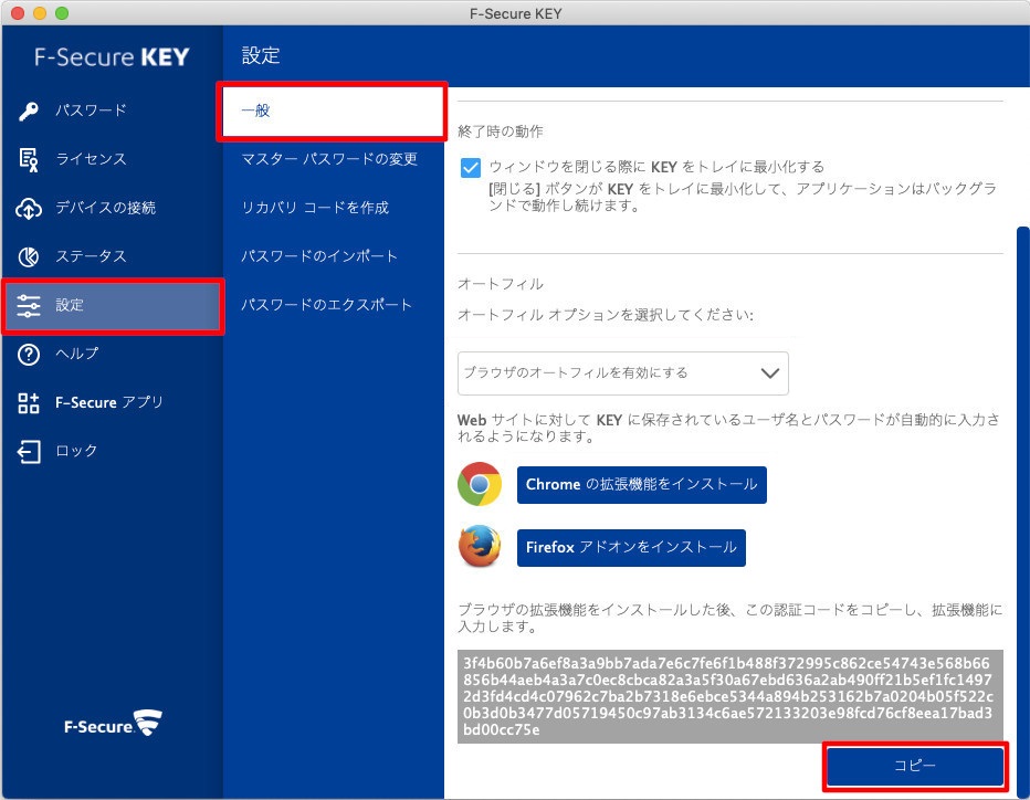 ④認証をおこないます。KEYのメイン画面を表示し「設定」をクリックしてください。「一般」をクリックし、認証コードの「コピー」をクリックしてください。