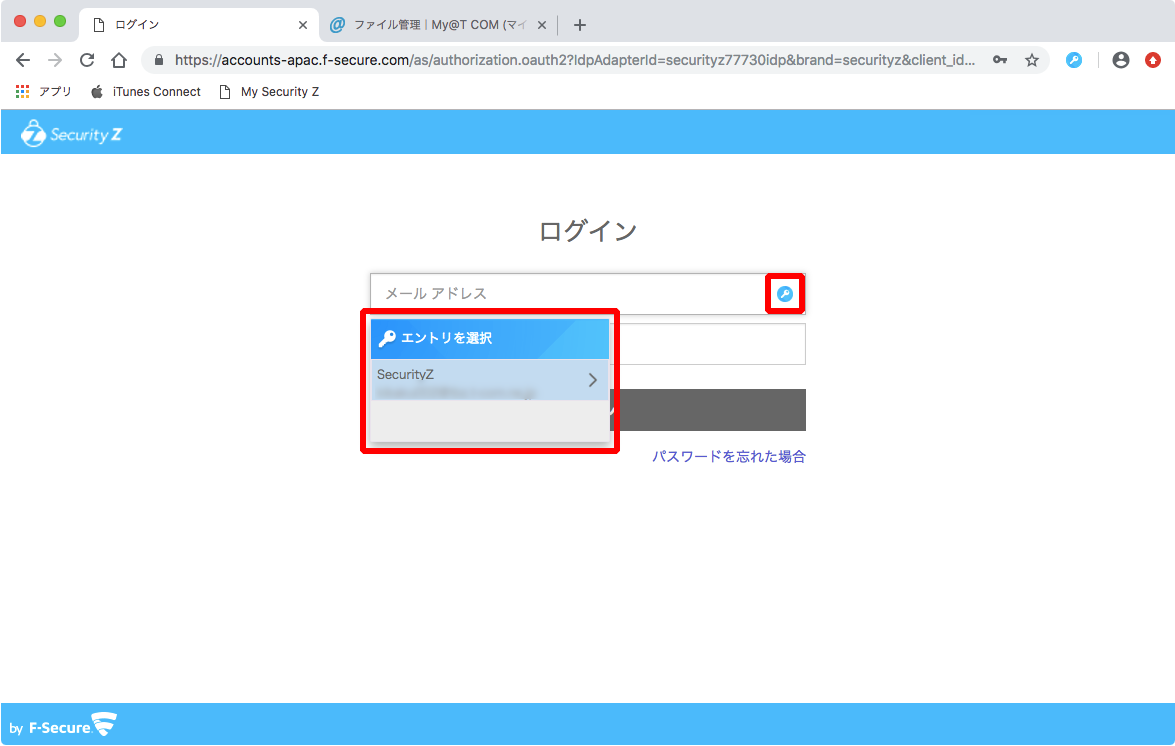 ⑥F-Secure KEYに登録されたURLだった場合、青い鍵マークをクリックすることで、以下のような表示がされますので選択・クリックすると自動で入力されます。