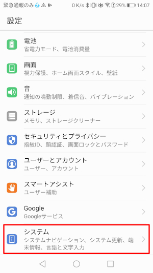 ⑧Android端末の設定を開き、「システム」をタップしてください。