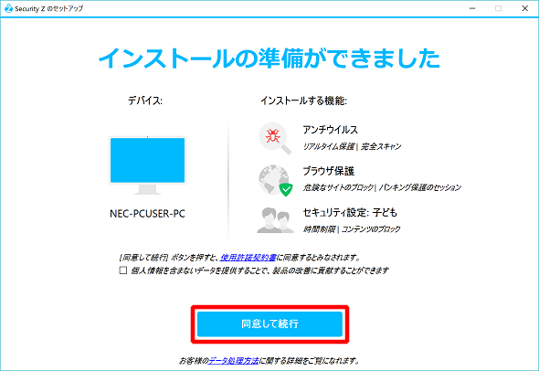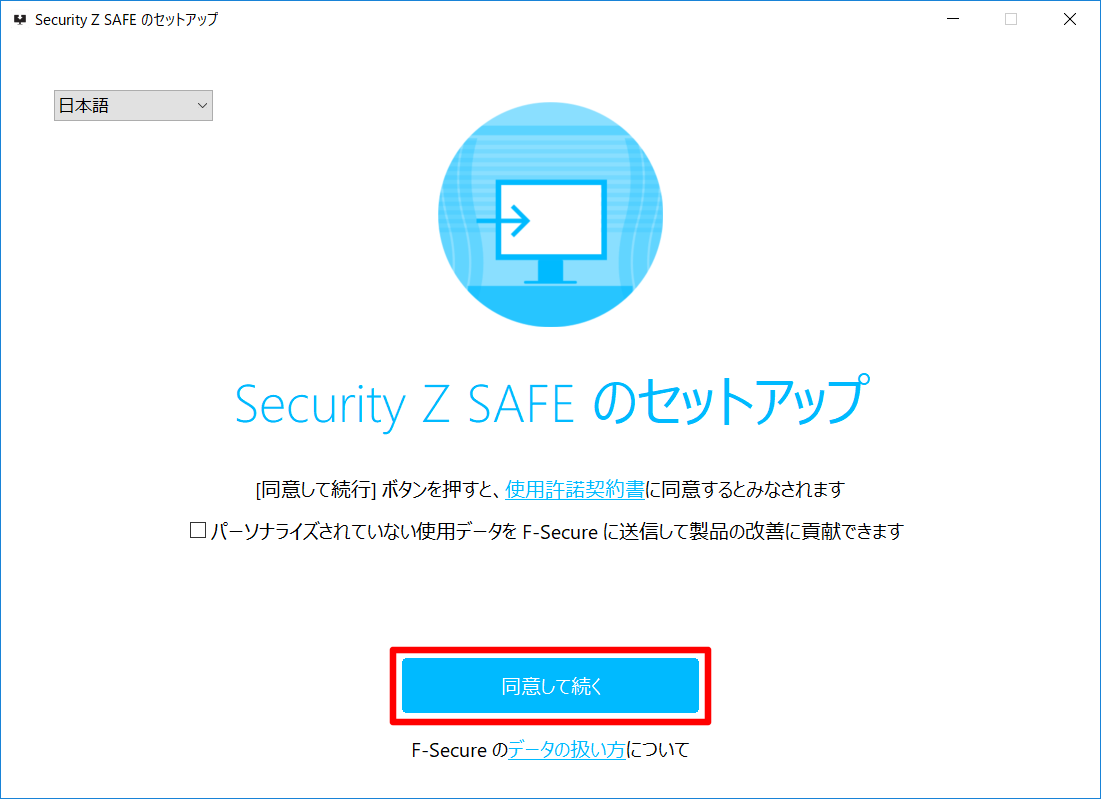 ⑤「使用許諾契約書」及び「データの扱い方」を確認の上[同意して続く]をクリックし、セットアップを開始してください。