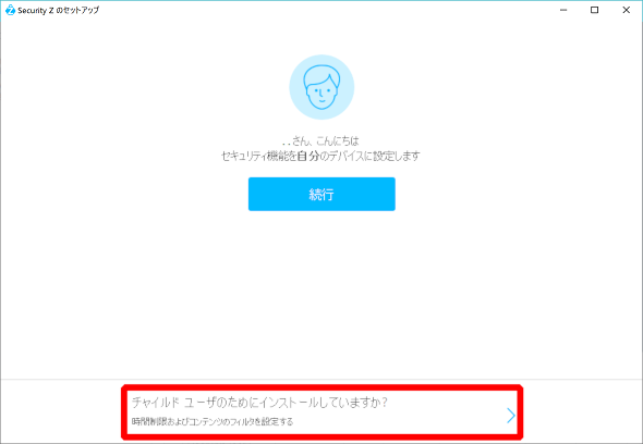 ⑨デバイスのアカウント使用者が子供の場合は「チャイルドユーザーのためにインストールしていますか?」をクリックしてください。自分の場合は、[続行]をクリックしてください。