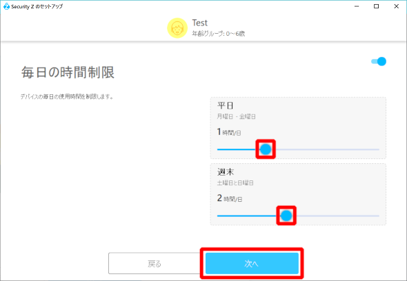 ⑬「毎日の時間制限」の画面が表示されますので、時間を設定し「次へ」をクリックしてください。