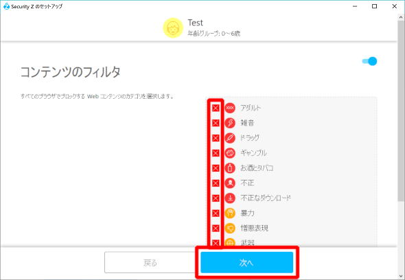 ⑮表示するコンテンツに制限を加えるには、ブロックしたいWebコンテンツを設定し、「次へ」をクリックしてください。