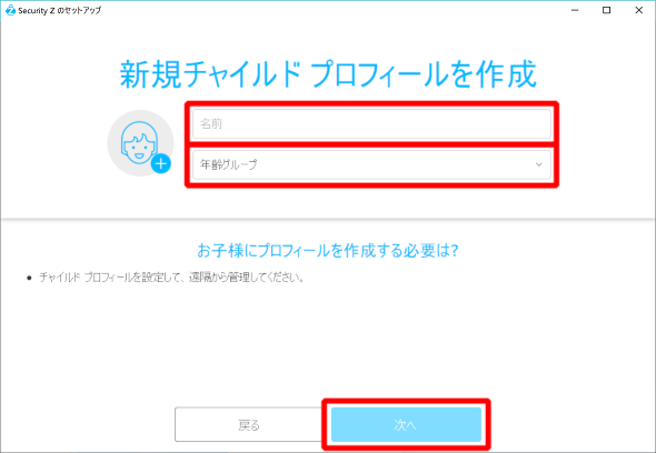 ⑪新しいチャイルドプロフィールを選択した場合、「新規チャイルドプロフィールを作成」という画面が表示されます。「名前」と「年齢グループ」を入力・選択し[次へ]をクリックしてください。