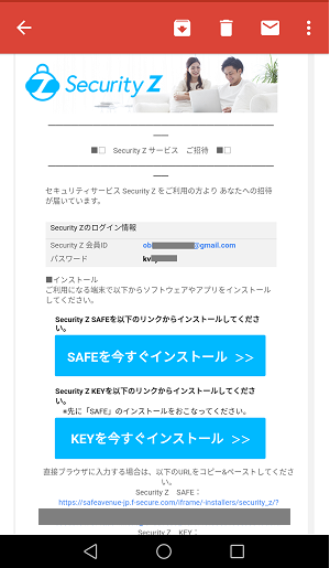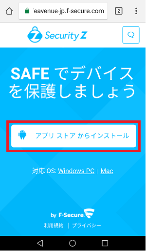 ①safeavenue@f-secure.com より「【重要】オンラインセキュリティサービス Security Z 会員IDとパスワードのお知らせ」というメールが届きます。 メール本文にある「SAFEを今すぐインストール」をタップしてください。