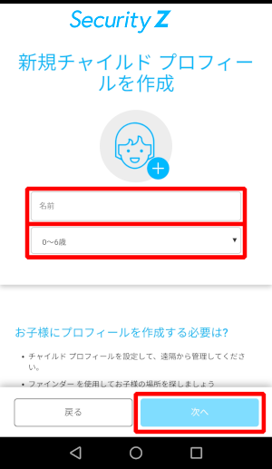 ⑫子供のアカウントを選択した場合、「新規チャイルドプロフィールを作成」画面が表示されます。「名前」と「年齢グループ」を入力・選択し[次へ]をタップしてください。