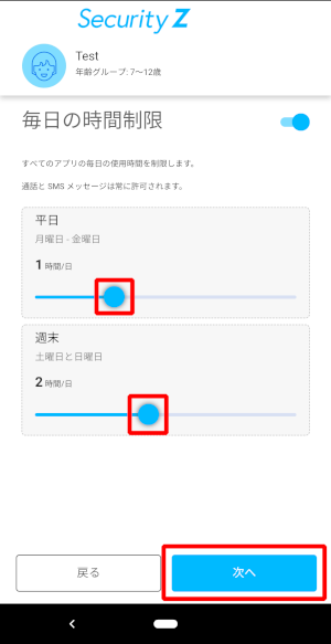⑯「毎日の時間制限」の画面が表示されますので、時間を設定し[次へ]をタップしてください。