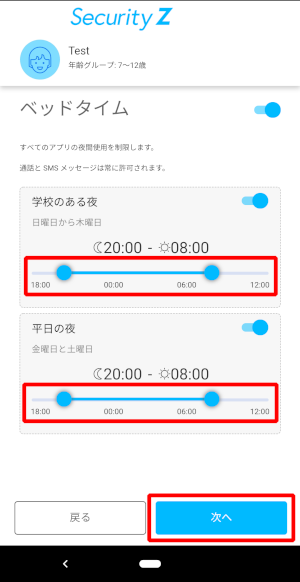 ⑰「ベッドタイム」の画面が表示されますので、時間を設定し[次へ]をタップしてください。