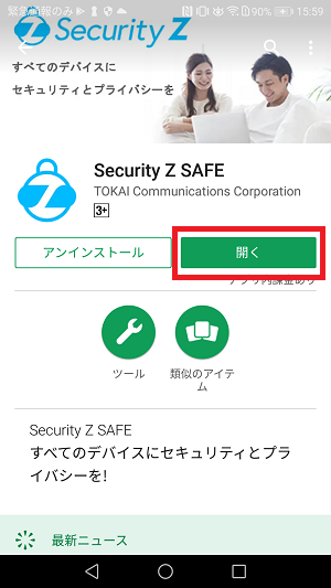 ④インストールが完了したら、「開く」をタップして、Security Z SAFEを起動してください。