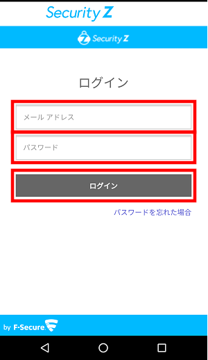 ⑦Security Z SAFEのログイン画面が表示された場合は、「【重要】オンラインセキュリティサービス Security Z 会員IDとパスワードのお知らせ」メールに記載されているSecurity Z 会員ID(メールアドレス)とパスワードを入力し、[ログイン]をタップしてください。